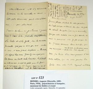RONDEL Auguste [Marseille, 1858 - Paris, 1934], polytechnicien et banquier, passionné de théâtre et grand collectionneur français.Lettre autographe signée. Marseille, 24 septembre 1915 ; 4 pages in-12.