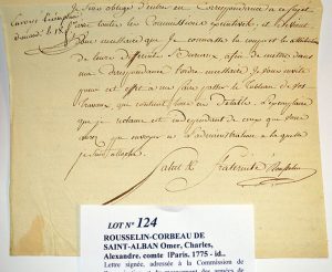 ROUSSELIN-CORBEAU DE SAINT-ALBAN Omer, Charles, Alexandre, comte [Paris, 1775 - id., 1847], journaliste et administrateur, il sera consul en Égypte sous l’Empire. En 1794, il est agent national auprès du district de Caen.Lettre signée,...
