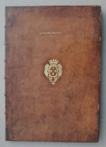 dédicace, et 33 planches de médailles dans des encadrement historiés. Mention «  club des Arcades  » en lettres dorées sur le premier plat, du nom d’un club politique du début de la révolution qui était hébergé, par le duc d’Orléans, dans les galeries du Palais Royal. Armes d’un Bourbon placées postérieurement. Ex-libris gravé et armorié de Pecquot de Saint-Maurice.