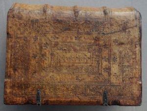 Nombreuses initiales historiées gravées sur bois. Un des premiers livres imprimées à Dillingen, en Bavière, peu de temps après la fondation de son université, en 1649. Les plats sont ornés d’une belle roulette signée NP et datée de 1555 représentant des scènes bibliques. Bon exemplaire. Manque les feuillets 290 à 319.