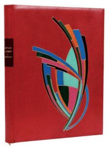 Léon COURBOULEIX. Bien complet de la suite des illustrations en noir et blanc. Très belle reliure in-4 plein maroquin rouge, plat orné d’une composition mosaïquée et constituée de cuir rouge, orange, bleu, vert, bleu ciel et rose. Gardes et contre plats en daim bordeaux, dos lisse, tête dorée, couvertures conservées, chemise et étui de demi maroquin rouge