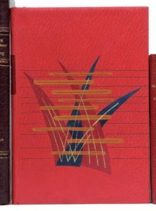 recouverts d’un motif géométrique représentant une gerbe en cuir bordeaux, bleu et marron, surlignée de liserés or. Pièce de titre au dos sur cuir bordeaux, contre plats de plein maroquin bordeaux, tête dorée, couvertures conservées, chemise et étui de maroquin vieux rouge –