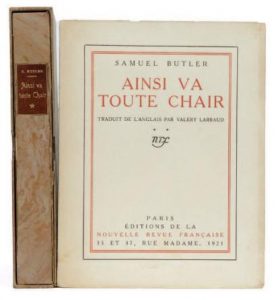 BUTLER Samuel : Ainsi va toute chair. NRF Paris 1921. E.O. française (traduction de Valery LARBAUD). L’un des 120 ex sur pur fil, papier de tête, réimposés au format in-8. Deux volumes brochés présentés dans deux chemises et étuis, plein...