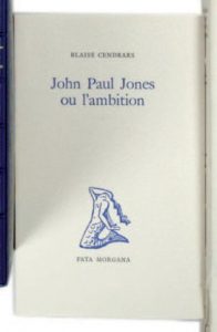CENDRARS Blaise :John Paul Jones ou l’ambition. Fata Morgana éditeur Cognac. E.O. L’un des 50 ex de tête sur pur fil. Broché in-8. Etat de neuf, non coupé –