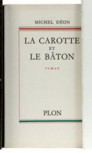 DEON Michel : La carotte et le bâton. Plon Paris 1960. E.O. L’un des 45 ex sur pur fil, 2ème papier après 5 Hollande. Très bel envoi pleine page au Docteur DORBON. Reliure in-8 demi chagrin bordeaux à coins, dos à 5 nerfs légèrement...