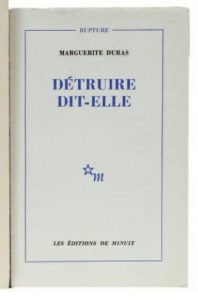DURAS Marguerite : Détruire dit-elle. Editions de minuit Paris 1969. E.O. L’un des 99 ex sur pur fil, seul grand papier. Broché in-12, dos très légèrement frotté –