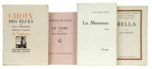 GIRAUDOUX Jean :Ensemble de 5 livres brochés en E.O sur grand papier, Choix des élus (Grasset 39- L’un des 45 ex de tête sur Japon , envoi à André COUDRAY), Le cerf ( A la cité des livres 26 - l’un des ex H.C sur Hollande, 3ème papier), La...