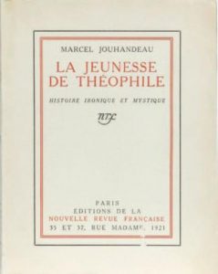 JOUHANDEAU Marcel : La jeunesse de Théophile. (NRF 21 – L’un des 100 ex de tête sur pur fil réimposés. Très bel envoi à l’écrivain Marcel SCHNEIDER –