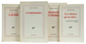 MALRAUX André :Ensemble de 4 livres brochés en E.O sur grand papier  ; Antimémoires (Gallimard 67 – L’un des 310 ex sur pur fil, 2ème papier), Les chênes qu’on abat (Gallimard 71 – l’un des 320 ex sur pur fil, 2ème papier), Oraisons...