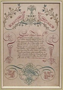(Calligraphie) - Invocation religieuse pour la longévité du Roi de France. [France, fin 18e ou début 19e s. ?]. Calligraphie originale (texte 11 x 11 cm), 13 lignes dont la première en rouge, avec jeux de plume aux encres de couleur figurant des...