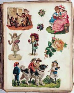 (Chromos) - +/- 2.200 découpis. [19e siècle]. Formats divers, collés en plein sur ff. de support et disposés de façon charmante. Dans 2 albums ad hoc in-8° oblong ou in-4° : demi ou pleine toile gaufrée avec ill. et titre "Album" (plusieurs...