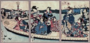 (Bijin-gâ) - KUNISADA, Utagawa (Utagawa Toyokuni III).- Sumidagawa [Excursion nautique sur la rivière Sumida]. Éditeur Sawamuraya Rihei, [1856]. Triptyque, öban tate-e, couleurs rouge et bleu, signé Okö Kochörö Kunisada-ga dans la partie g....