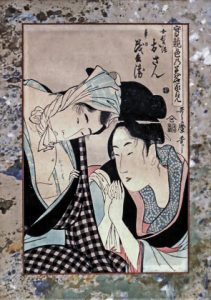 Osan et Mohei partagent leur amour, Osan dévoilant le nom de sa bien aimée tatoué sur sa poitrine. Joint : EISEN.- Nihon san fukei [Trois paysages connus du Japon]. District de Ama no hashidate, dans la province de Tang. Éditeur : Ezakiya Kichibei, [circa 1820]. Oban tate-e, couleurs pâles, cachet kiwame (usures et taches). Sous passe-partout, vitre et cadre de bois doré. Représente la belle Hanamurasaki de la maison de geishas Tamaya.