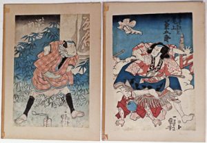 (Kabuki-e) - KUNIYOSHI, Ichiyusai.- 5 estampes (Kabuki-e sauf 1 mushi-e). Oban tate-e, nishiki-e, retenues par le bord sup. sur ff. de support (usures sur les cötés, parfois assez fortes, qqs rouss., papier pelucheux).