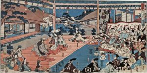 KUNISADA, Utagawa (Utagawa Toyokuni III).- Rokuhara gosho kiyomori-kö yüen no zu [Banquet et spectacle de danse privé donné pour le général Kiyomori au palais Rokuhara de l'empereur]. Éditeur Sugiwaraya Kiyo ou Sugiya Seibei, [1844-1845]....