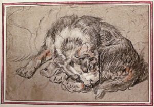 (École flamande) - Dessin - Chien dormant. Étude. [17e siècle]. Dessin original, pierre noire et sanguine, papier gris vergé non filigrané, 17,8 x 26,7 cm (ancienne note ms. au verso, fixé par les coins sup. sur carton de support).
