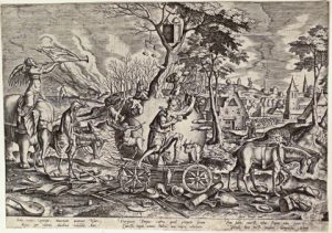 (École flamande) - GALLE, Philippe (1537-1612).- Le Triomphe du Temps ou de Saturne [d'après Pieter BrUEGHEL (c. 1525-c. 1569)]. 1574. Burin, cuv. 21 x 30 cm (rognée à la cuv., lacune comblée au coin inf. dr., collé en plein sur papier et fixé...