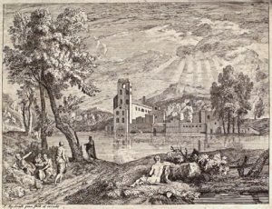 (École flamande) - RYSBRACK, Pieter (1655-1729).- 2 estampes : Diane au bain.— Femme au dos nu assise près d'une rive, un groupe à sa gauche et une maison domaniale dans le fond. Eaux-fortes, TC 17,5 x 20 cm et 16 x 21,3 cm (rognées, fixées...