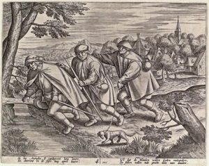 (École flamande) - "Si les Aveugles se conduysent lung lautre [...]. Ist dat de Blinden willen leyden malcandere [...]" [d'après Pieter BRUEGHEL (?)]. [Amsterdam], C.J. Visscher, s.d. Eau-forte, cuv. 18 x 22,8 cm + très grandes marges, fin papier...
