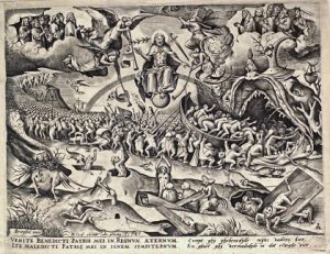 (École flamande) - VAN DER HEYDEN, Pieter (1530-1576).- Le Jugement dernier [d'après Pieter BRUEGHEL (c. 1525-c. 1569)]. [Anvers], H. Cock, 1558. Burin, 22,6 x 29,3 cm (remargé, fixé par les coins sup. sur carton de support).