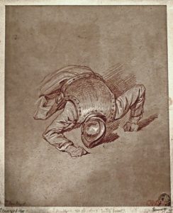 (École française) - Dessin - [Attribuable à l'atelier des PARROCEL].- Soldat terrassé. Étude. Dessin original, sanguine, rehauts de craie blanche, papier gris, 28,7 x 23,6 cm, signé en bas à dr. (collé sur papier de support).