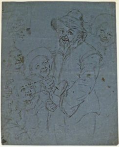 (École hollandaise) - Dessin - [Suiveur de HALS, Frans (1580-1666)].- Le Joueur de "rommelpot" (ou tambour à friction) entouré de six enfants. Dessin original, pierre noire, papier bleu vergé, 31 x 25 cm (plis, traits à l'encre noire, petites...