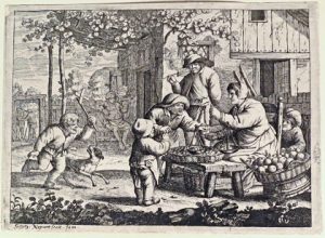 Joint : (1). DE BYE, Marcus (1639-c. 1690).- 4 gravures d'ours [d'après Marcus GÉRARD (c. 1530-c. 1590)]. E.-f., TC 10,5 x 14 cm (rognées au TC, fixées par les coins sur cartons de support).— (2). NYPOORT, Justus van den (c. 1625-c. 1692).- La marchande de pommes. E.-f., cuv. 13 x 18 cm (rognée en deça de la cuv., fixée par les coins sur carton de support). ▲ Provenance : Gaston de Ramaix (cachet; # Lugt 4099).