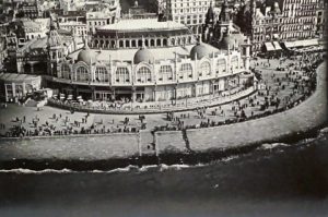 De haven met zeilboten en stoomschepen, een uitvarend stoomschip, paardengespannen in de straten, luchtopnamen van het Kursaal... Biiaevoead : Toeristisch fotoboekie met 12 albumineopnamen, 6 x 9,5 cm, cartonnage van rood percaline.