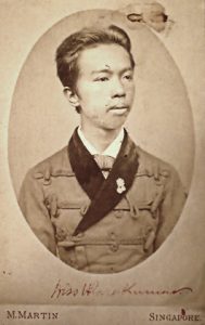 Note au verso : "Prince royal de Siam, désigné par le Roi, pour me faire voir le Palais etc. et à Siam". Warakumar est probablement un des 33 fils (sur 77 enfants) du roi Chulalongkorn de Siam, qui régna de 1868 à 1910 sous le nom de Rama V, souverain aimé qui modernisa son pays et empêcha la colonisation européenne au prix de la perte du Laos. Chulalongkorn fut l'un des nombreux enfants de Rama IV a bénéficier des services de la gouvernante anglaise Anna Leonowens dont les aventures romancées sont connues par le film "Anna et le Roi". # http://archiviodistatotorino.beniculturali.it/work/dgdetl.php?id=203 (archives turinoises qui conservent un portrait identique).