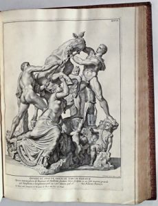 First edition of this nice collection of plates depicting ancient and modern Italian statues, mainly Roman, by the sculptor and engraver De Rossi (1659-1730). This work contains an engraved title and allegorical dedication to Clement XI and is composed of 161 (of 163) steel-engravings by a.o. Francesco Aquila, Nicolas Dorigny and François Handriot figuring the Borghese gladiator, The rape of the Sabin women, Urban VIII, Hercules Aventinus, Innocent X, Julius Caesar, David... Preceded by a descriptive text of the antiquarian Paolo Alessandro Maffei (1653-1716). Text decorated with two historiated head-pieces, two tail-pieces and with ornemental initial letters. Copy with wide margins. # Cicognara 3523; # Kat. Berlin 4206; # Brunet IV-1406. fl Edizione originale contenente un frontespizio inciso, una tavola dedicatoria e 161 (su 163) incisioni in rame dall'Aquila, dal Dorigny, Handriot... Pieno marochino rosso coevo (quaderni di testo invertiti, arrossature, legatura graffiata, dorso lievemente scolorito). fl Édition originale de cette collection de planches figurant des statues anciennes et modernes d'Italie. Avec un titre et une dédicace gravés et 161 (sur 163) gravures. Plein maroquin de l'ép. (pl. CLXII et CLXIII manquantes, cahiers de texte inversés, rouss., éraflures et griffes à la rel., dos lég. passé).