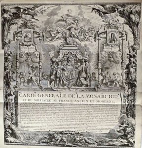 Édition originale de cet ouvrage présenté sous forme de tableaux synoptiques destinés à être montés en une seule grande carte. Publication de prestige finement gravée sur papier fort renfermant le titre (avec Avertissement),- la dédicace gravée dans un décor allégorique avec les portraits de Henri IV et Louis XIV,- 15 tableaux synoptiques illustrés de portraits en médaillon des rois, de vues de Versailles, Paris, l'Hotel royal des Invalides et les plans miniaturisés de 101 villes de France, en 202 médaillons, avec leurs fortification et armoiries,- d'un feuillet avec tableau et Approbation.