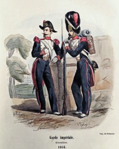 Selon Colas, l'ouvrage parut d'abord sous le titre "Galerie des victoires et conquêtes de l'armée française [...]", Paris, Frères-réunis, 1847-1849, en 5 vol.; puis sous notre titre à Paris, Dutertre, 1860-64. En réalité, cette édition s'est prêtée à de nombreux travestissements et a paru sous des titres, dates et noms d'éditeur différents, avec un nombre de planches et de volumes variables. L'illustration sur acier ou sur bois gravée par Philippoteaux, Bellangé, Charpentier, Morel-Fatio, etc., se compose de 5 frontispices et de 152 hors-texte, dont de nombreux en couleurs, figurant des costumes militaires. Avec 1 carte générale de la Crimée à la fin du volume V. Orné de plusieurs bandeaux historiés. # Colas 2285-2287; # pas dans Lipperheide.