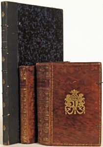 front.]-570-[132] pp. (qqs pp. lég. jaunies, claires mouill. marg., rouss., minuscules galeries ou trous de vers marg. au début, piqures à la fin, déch. marg. à la p. 447). Rel. armoriée de l'époque : plein veau marbré, plats sertis d'une roul. dorée avec armoiries dorées au centre, dos fleuronné doré à nerfs, tr. marbrées (lacets de fermeture part. ou entièrement manquants, coiffe sup. manquante, rel. part. et lég. frottée, coupes et coins lég. émoussés, note ms. au contreplat inf.).