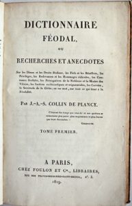 (Moyen âge) - COLLIN PLANCY, Jacques-Albin-Simon.- Dictionnaire féodal [...]. Paris, Foulon et Cie, (imprimerie de Fain), 1819. 2 vol. in-8° : xxxiv-333, [4]-316 pp. (pet. rouss., pet. perforation marg. à la p. 41 du vol. II). Rel. de l'époque :...