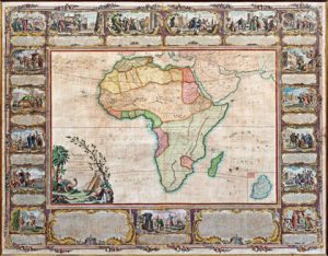 Rare et exceptionnelle grande carte du continent, avec cartouche de titre orné de personnages et animaux et une carte détaillée de l'ïle de France. Sertie d'un large encadrement composé de 2 grands cartouches de texte donnant une "Idée historique de l'Afrique ancienne et moderne" et de 17 scènes d'histoire légendées : destruction de Carthage, conquête de l'Égypte par les Turcs, établissement des Portugais et Hollandais en Afrique, etc. Gravée par G.-D. Chambon. # Tooley III-150; # manque à Tooley, Maps of Africa. • Superbe carte mise en couleurs et dans un très beau cadre. fl Exceptional, rare and very large wall map of Africa; decorative border with 17 cartouches figuring historical scenes. Copper-engraving, heightened, framed (slightly browned and mould, restored marginal tear without loss).