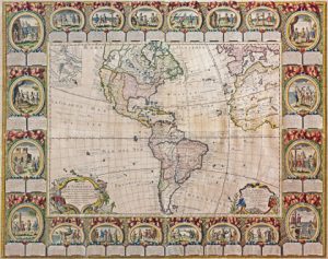 Importante carte, très décorative, du continent américain (septentrional et méridional), par l'abbé Clouet (né en 1730). Sertie d'une large bordure de 20 médaillons avec des scènes d'histoire légendées évoquant la "Première Colonie dans la Floride", la "Découverte de la Mer du Sud", la "Découverte du Détroit de Mallegan", l'"Établissement de l'Empire du Mexique", la "Découverte du Brésil", etc. # Tooley I-274 (datée 1776). fl Large wall map of the American continent, north and south, within a large rococo border of 20 vignettes on the discovery of America with captions. Copper-engraving, heightened, framed (small perforation in one key).