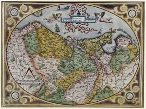(Europe, Belgique & Pays-Bas) - ORTELIUS, Abraham.- Descriptio Germaniae Inferioris. Eau-forte, 37 x 50 cm + marges, rehaussée à l'aquarelle. Sous passe-partout, vitre et cadre de bois foncé (non désencadrée).