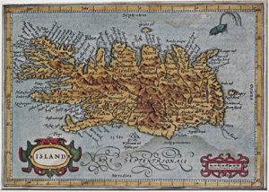 (Europe, Islande) - ORTELIUS, Abraham.- Island. Gravure sur cuivre, 13,1 x 18,7 cm + marges, rehaussée à l'aquarelle (fixée sous passepartout).