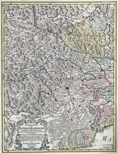 (Europe, Italie) - LOTTER, Tobias Conrad.- Cursis Padi per Longobardiam a fonte usque ad Ostia [...]. Gravure sur cuivre, TC 57,8 x 45,2 cm + bonnes marges, rehaussée à l'aquarelle, verso blanc.