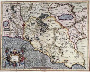 (Europe, Italie) - MERCATOR, Gérard.- Latium nunc Campagna di Roma. [1606]. Gravure sur cuivre, TC 36,8 x 46,9 cm + grandes marges, rehaussée à l'aquarelle.