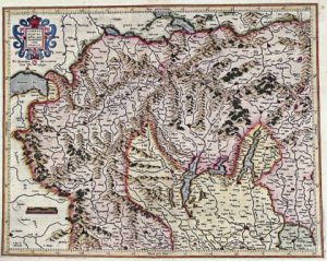 (Europe, Italie) - MERCATOR, Gérard.- Lombardiae Alpestris pars occidentalis cum Valesia. [1606]. Gravure sur cuivre, TC 35,5 x 44,7 cm + grandes marges, rehaussée à l'aquarelle.