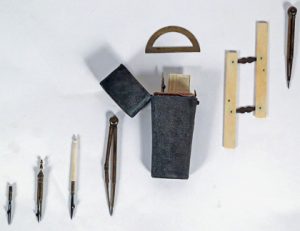 sèches ou à l'encre), 2 règles (1 parallèle et 1 graduée). Sous étui gainé en galuchat gris (17 x +/- 7 cm) portant à l'intérieur l'étiquette "I Case/ Patent/ Mathematical Instruments/ n° 082 [chiffre ms.]".