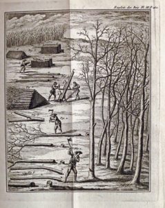 Édition originale de ce traité d'exploitation sylvicole, avant-dernière partie du grand "Traité complet des bois & des forêts" comprenant le "Traité des arbres et des arbustes" (1755), la "Physique des arbres" (1758), les "Semis et plantations" (1760) et se terminant par "Du transport, de la conservation et de la force des bois" (1767). L'ouvrage traite de la physique du bois, des taillis, des futaies et leur abattage, de l'exploitation des futaies et de l'exploitation des "Bois-Quarrés". Illustré d'un bandeau figurant une exploitation et de 36 planches dépliantes donnant une vision détaillée des techniques d'exploitation, du découpage du bois et de l'outillage nécessaire. # Wellcome II-495; # pas dans Nissen BBI, Pritzel, Plesch, Hunt. ▲ Provenance : A. de Brasse ou Braffe (mention d'app. ms.).
