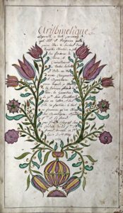 Beau manuscrit pédagogique enluminé de près de 80 grandes compositions à l'aquarelle cernées à la plume : titre, table de calcul de forme ronde, cadres ornés, grandes lettrines historiées ou décorées, etc. Le manuscrit "ne formera qu'un Abrégé des Arimétiques [sic], et Géométrie du f[rè]re J.B. Feraud. par [prénom effacé] Tuquat, sous la Conduite du dit f[rè]re J.B. feraud hermite, à St. Loüis Le 1er may 1772". Il est destiné à servir à ceux qui pratiquent le commerce et les finances mais aussi "toutes sortes D'Arts" : maçons, charpentiers et arpenteurs. Le texte, cerné d'un filet à la plume, est divisé en trois parties contenant des explications de règles, des propositions, exemples d'opérations, exercices, problèmes à résoudre, etc. Le manuscrit peut être localisé dans le sud de la France (Midi Méditerranée) grâce aux références faites au "millerolle", ancienne mesure de liquide (surtout d'huile) employée dans cette région et valant environ 64 litres. Le colophon, "Signé A.", est ainsi libellé : "Le... 23e Termidor de L'An du Citoyen Cuomniale [?] de Lan de grâce 1792", cette date semble correcte si on considère la référence au mois révolutionnaire, mais la date sur le titre est clairement marquée 1772.