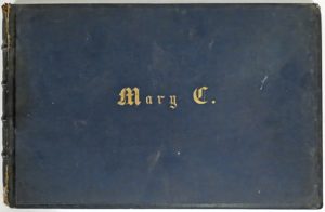 classées par ordre alphabétique, index mss (incomplet d'une 15aine de lettres dont il ne reste que les onglets (?), lég. us. à qqs-unes). Dans un album ad-hoc in-4° oblong : demi-chagrin bleu, plats de percaline chagrinée bleue cernée d'un filet gras à froid, plat sup. avec mention "Mary C" dorée, dos à nerfs (mors sup. part. fendu, caisson inf. manquant, mors inf. part. fendu, coins émoussés).