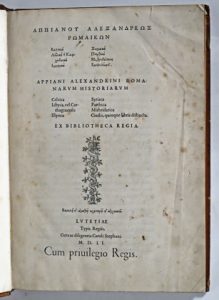(Antiquité & Militaria) - APPIANUS Alexandrinus.- Ртџсакат [...]. Romanarum historiarum, Celtica, Libyca, vel Carthaginensis, Illyrica, Syriaca, Parthica, Mithridatica, civilis, quinque libris distincta. Ex bibliotheca regia. Luteatiae...