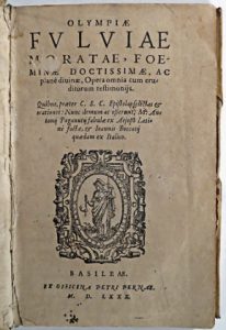 MORATI GRÜNTHLER, Olympia Fulvia.- Opera omnia cum eruditorum testimoniis [...]. Basileae, ex officina Petri Pernae, 1580. In-8° : [24]-551 pp. (quire ** bound at the end -between text lvs- with lvs inverted, browned, marginal dampstains in the...