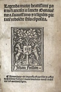 Very early postincunabulum of this famous biography of Saint Francis of Assisi. Jean Barbier and Jean Frellon edition, though no copy has been found with Frellon name, printed after 1508 as Barbier became that year "librarii jurati". The "Legenda maior" was ordered to the Franciscan Bonaventura (1221-1274) in 1263 and is composed of a prologue, the biography of the Saint and by miracles occured after his death. The theologian and cardinal of Albino Bonaventura studied at the University of Paris under Alexander of Hales and John of Rochelle and became Doctor at the same time of Thomas ab Aquinas in 1257. The same year, because of his order defense against the anti-medicant party, he was named Minister General of the Franciscan Order. Bonaventura was canonised in 1482 and named Doctor of the Church in 1587 (nicknamed "Seraphi Doctor"). Text in Gothic typesetting with ornemental initial letters, mostly dotted, and with the mark of Jean Frellon, also dotted, on the title-page contrarly of the copy listed by Renouard which presents the vignette of Barbier. # Renouard.- Imprimeurs et libraires parisiens du XVIe siècle. Paris, Service des travaux historiques de la Ville de Paris, 1979, 244; # USTC 143394; # not in Adams, Machiels, Soltész, STC French. Bound with, same condition : PERAULT, Raimond.- Vita dive virgi[ni]s ac martyris : Christiq[ue] sponse singularis Katherine Costi regis filie [...]. Cum dive Helene crucis Christi salutifere inuentricis ad calce[m] adiecto Panegyrico [...]. Parrhisios, in officina Ascensiana, (pridie Penthecostes 1511). [64] lvs. Postincunabulum (1st ed. : Bale, 1504) containing the biography of Saint Catherine and the praise of Saint Helene by Perault (1455-1505), bishop of Saintes and cardinal of Gurk, edited by Jean Cavellat. Text in Gothic typesetting with ornemental initial letters, mostly dotted, and with the portrait of Catherine on the title-page. # Renouard II-207; # USTC 180647; # not in Adams, Machiels, Soltész, STC French. ▲ Provenance : "Bibliotheca Renessiana" (ex-libris). fl Post-incunable de la biographie de Saint François par Saint Bonaventura. Relié avec une biographie de Sainte Catherine et une louange de Sainte Hélène par R. Perault, cardinal de Gurck. Demi-veau marbré à petits coins du 19e s. (lég. us., rel. lég. frottée).
