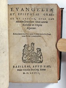 (Religion) - Ens. 2 ouvr. en 1 vol. in-12° - Evangelia et epistolae graece et latine, quae annuatim secundum ritum veteris ecclesiae in templis leguntur [...]. Basileae, apud haeredes Nicolai Bryling, 1572. Small in-12° : [2]-284 pp. (repair in the...