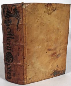 Parisiis, apud Carolum Maceum, 1577. 4 parts in 1 vol. in-8° : 8-[16]-296, 83-[1 bl.], 132 [i.e. 134], 68 lvs (third and fourth parts inverted, slightly browned, some lvs stronger, dampstains, small marginal wormholes in lvs 275296 of 1st part, marginal tears). Contemporary binding : limp parchment with small flaps, flat spine with ink title in length, chiselled edges (stains, browned spine, flyleaves lacking).